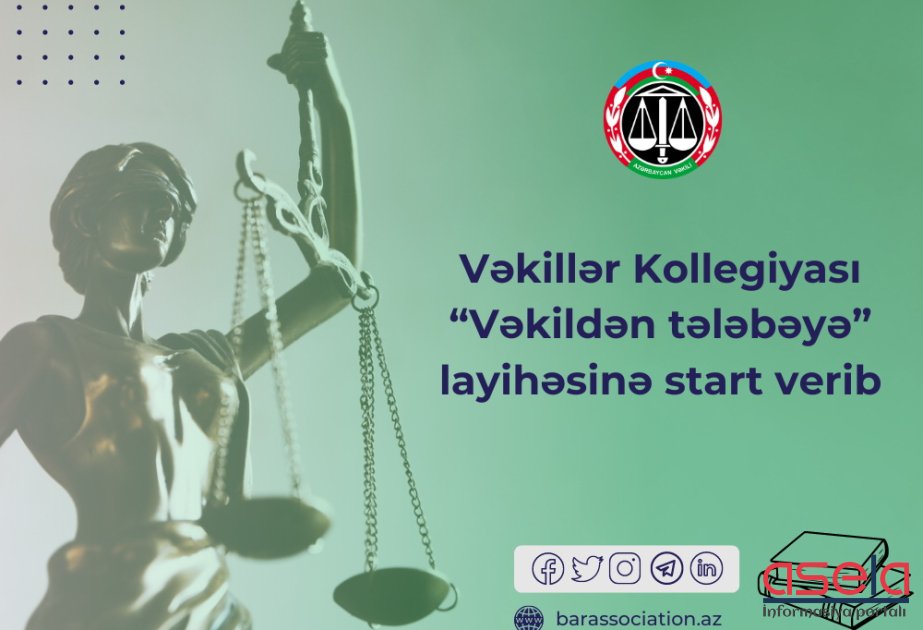 Vəkillər Kollegiyası “Vəkildən tələbəyə” layihəsinə start verib. Kollegiyanın mətbuat xidmətindən bildirilib ki, qurumun uğurlu layihələrindən hesab olunan “Vəkildən tələbəyə” layihəsi vəkillərin müvafiq sahələrdəki təcrübələrinin tələbələrə ötürülməsinə şərait yaradacaq. Belə ki, layihənin həyata keçirilməsində əsas məqsəd tələbələrin hüququn müxtəlif sahələrinə uyğun bilik və təcrübələrə yiyələnmələri, onların vəkillik fəaliyyəti ilə, eyni zamanda, Vəkillər Kollegiyasının beynəlxalq və milli sferadakı fəaliyyəti, peşəkar hüquqi yardımın göstərilməsində müxtəlif təşkilatlarla əlaqələrin qurulması prosesi ilə tanış olmalarından ibarətdir.
