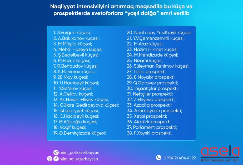 Nəqliyyat intensivliyini artırmaq məqsədilə bu küçə və prospektlərdə svetoforlara “yaşıl dalğa” əmri verilib: