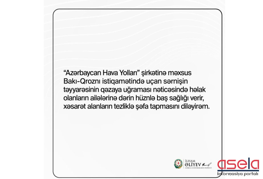 Paylaşımda deyilir: “Azərbaycan Hava Yolları” şirkətinə məxsus Bakı-Qroznı istiqamətində uçan sərnişin təyyarəsinin qəzaya uğraması nəticəsində həlak olanların ailələrinə dərin hüznlə başsağlığı verir, xəsarət alanların tezliklə şəfa tapmasını diləyirəm”.